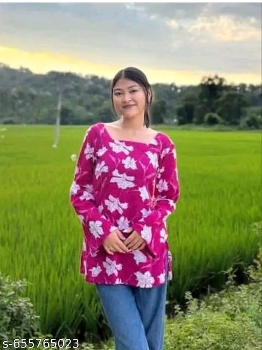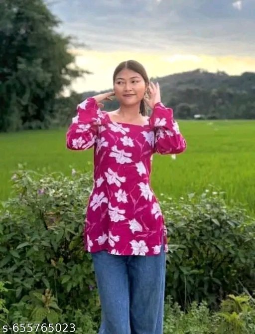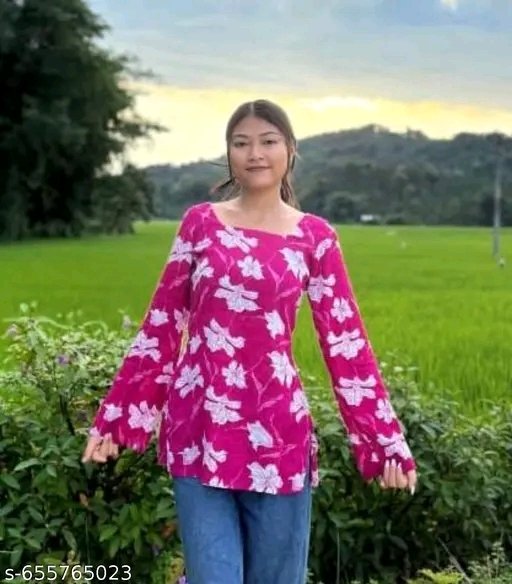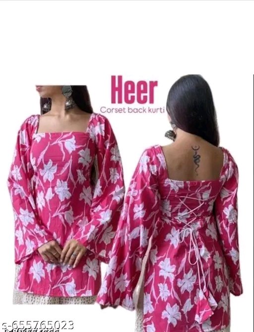 Introducing the latest addition to your ethnic wardrobe from Mannat fashion – a stunningly stylish pink kurti designed to make you stand out. This kurti features a beautiful and eye-catching floral print that adds a vibrant touch to its overall appeal. Crafted from comfortable and breathable cotton fabric, it ensures you stay comfortable all day long, making it perfect for both casual outings and festive celebrations. The design boasts a chic square neckline, which is a modern twist on traditional kurtis, offering a sophisticated look. Adding to its charm are the trendy bell sleeves, which give a graceful flow to your silhouette and are perfect for a fashionable statement. This kurti is further enhanced by a unique lace-up back design, providing a customizable fit and a touch of contemporary flair. The intricate detailing on the back makes it a truly special piece. Whether you’re heading out for a casual day, attending a family gathering, or celebrating a special occasion, this kurti is an excellent choice. It can be effortlessly styled with leggings, palazzo pants, or even a skirt to create diverse looks. Pair it with your favorite jhumkas and comfortable footwear to complete your ensemble. This versatile kurti is a must-have for any fashion-conscious woman looking for a blend of traditional charm and modern style. Embrace the elegance and comfort of this beautiful pink floral