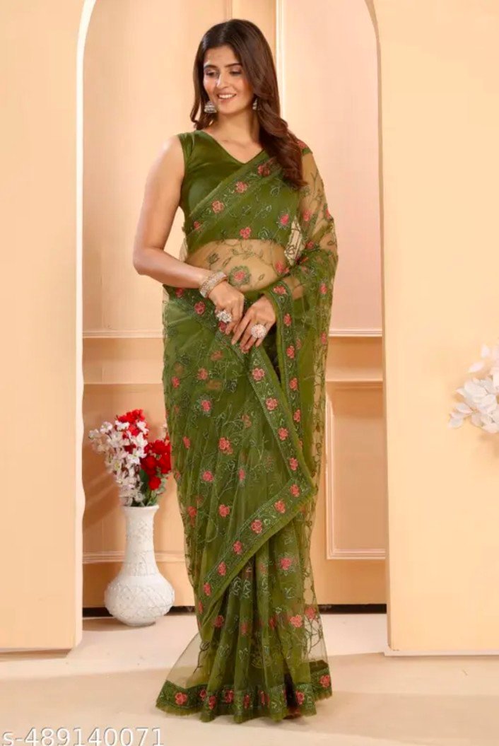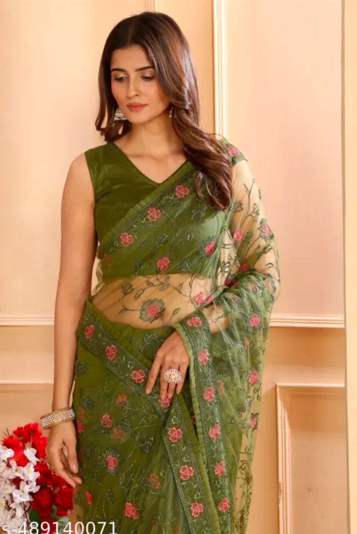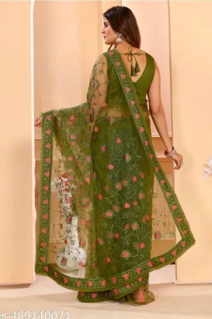 ** FABRIC ** : Saree – Net (Color -Green) || Blouse -Art Silk (Color – Greeb) ** SIZE ** : Saree – 5.5 Meter || Blouse – 0.80 Meter** PACKEGE CONTAIN ** : 1 Saree || 1 Unstitched Blouse Piece ** DETAIL ** : Floral Zari Embroidery Work || Embroidery Border ** WHY PURCHASE? ** : Branded Product || Soft Finished || Comfortable To Wear || Best Quality In Best Price